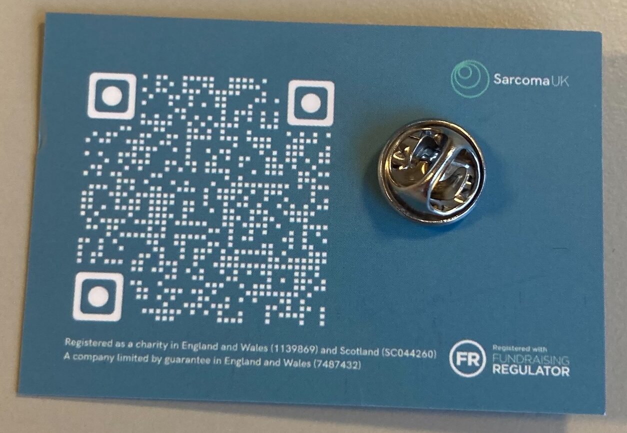 Our enamel Sarcoma UK pin badge with cardboard backing. Perfect for weddings and other events giving people the opportunity to donate.